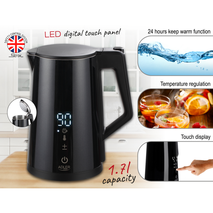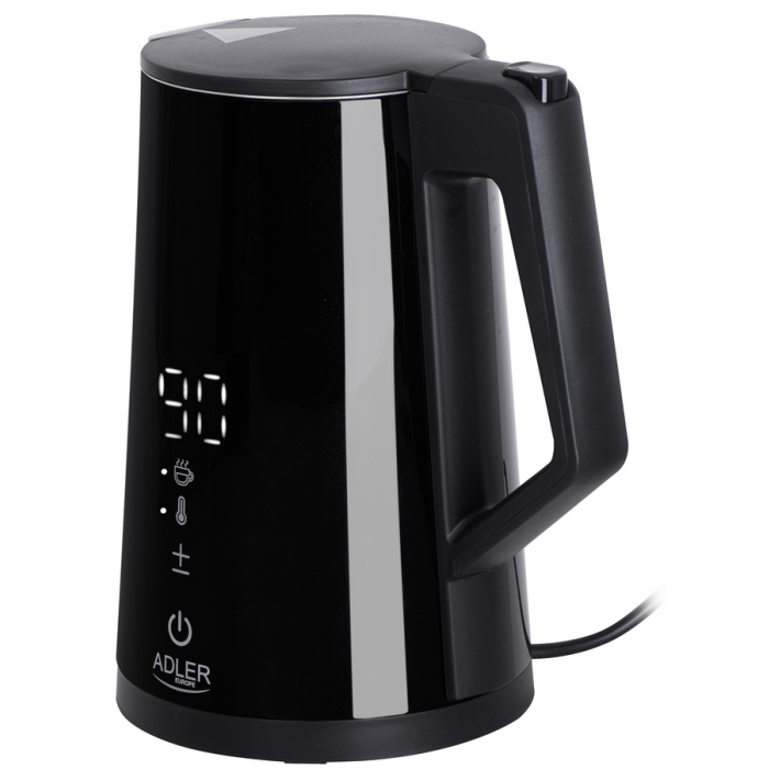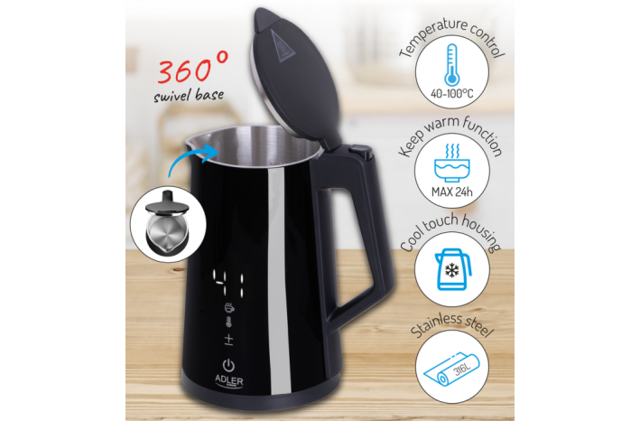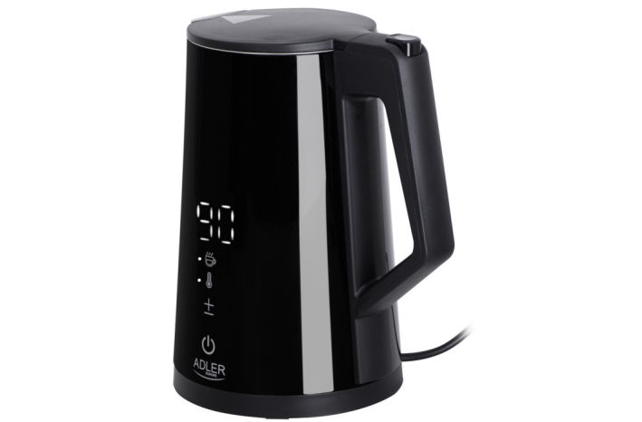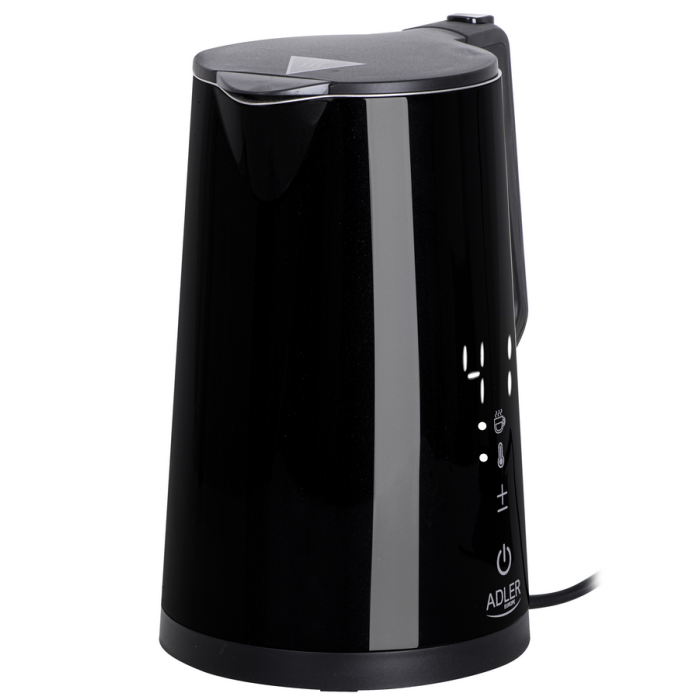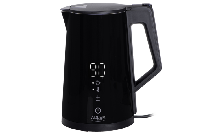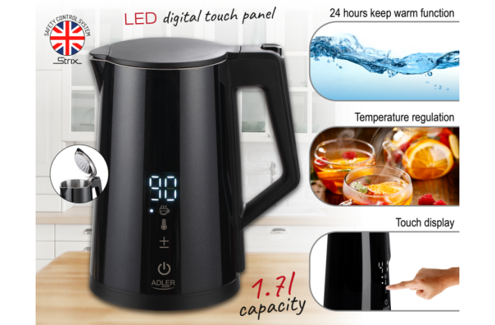 Električni grelnik vode Adler AD 1345 black ima LED zaslon in regulacijo temperature, kapaciteta znaša 1,7L. Opremljen je s STRIX varnostnim sistemom, ki preprečuje vklop praznega grelnika in samodejno izklopi po vrenju. Dvojno stensko ohišje omogoča hitro vrenje vode. Nudi temperaturne nastavitve od 40°C do 100°C, funkcijo ohranjanja toplote in ohišje, ki se ne segreva. Maksimalna moč grelnika je 2200W.