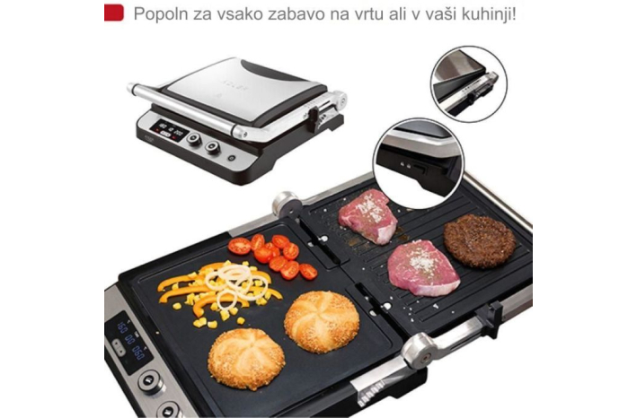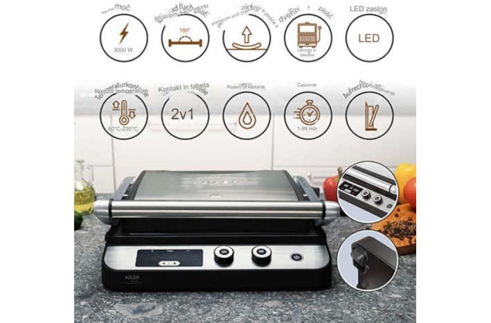 Električni žar Adler 3059 z diodo LED z največjo močjo 3000 W, vam omogoča pripravo številnih toplih jedi - od popečenih burgerjev, zrezkov, vratovine, piščanca in drugega mesa do zelenjave in sira na žaru. Kuhalna plošča je zaščitena s teflonsko prevleko, zaradi katere se jedi ne prijemajo, kasnejše pomivanje pa traja dobesedno le trenutek. Poleg tega prevleka omogoča peko na žaru brez dodajanja maščobe, zaradi luknje za odvajanje maščobe pa so jedi bolj zdrave. Naprava ima nadzorno ploščo z LED zaslonom.