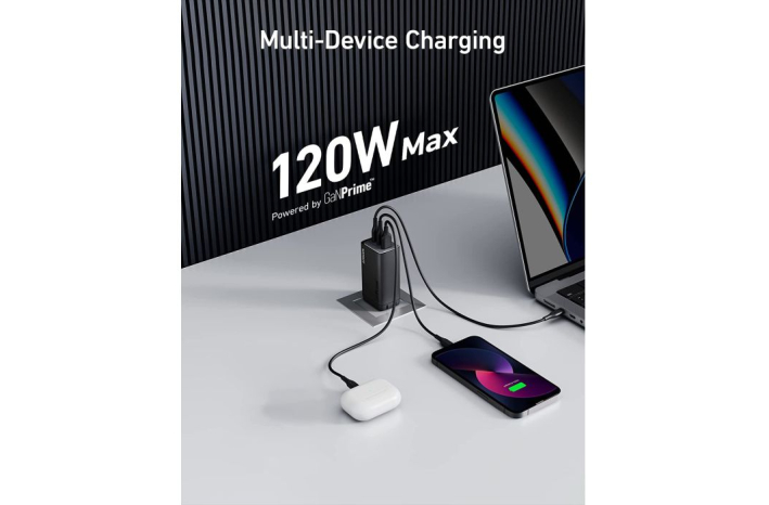 Polnjenje s tremi priključki: USB-C 1 + USB-C 2 + USB-A: 120 W MAX