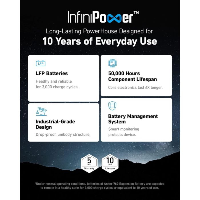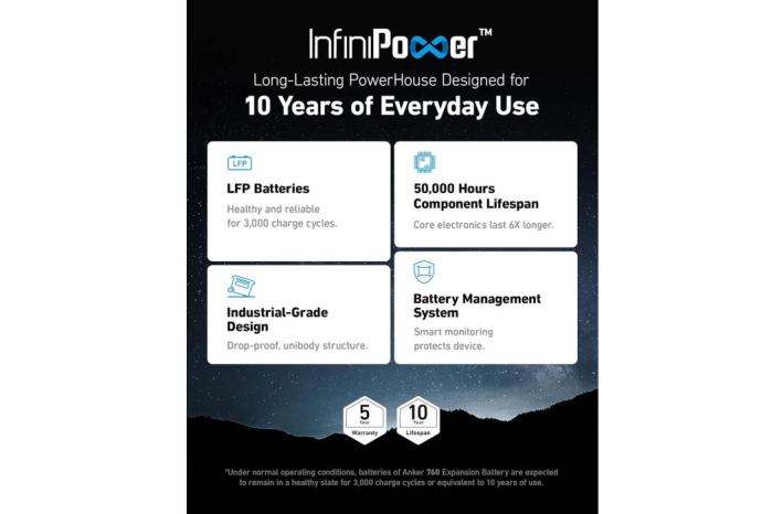 z našo lastno dolgotrajno tehnologijo InfiniPower™ v kombinaciji z baterijami LiFePO4, izjemno trpežnimi elektronskimi komponentami, pametnim sistemom za nadzor temperature, ki spremlja temperaturo do 100-krat na sekundo in Strukturna zasnova, odporna na udarce, je Anker Expansion Battery 760 zasnovana tako, da zdrži več kot desetletje, tudi pri vsakodnevni uporabi.