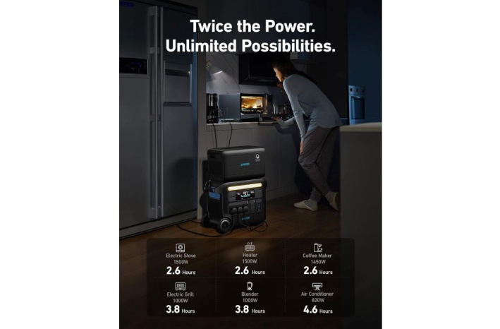uporabite razširitveno baterijo 760 (2048 Wh) z Anker PowerHouse 767 (2048 Wh) in povečajte kapaciteto baterije na 4096 Wh.