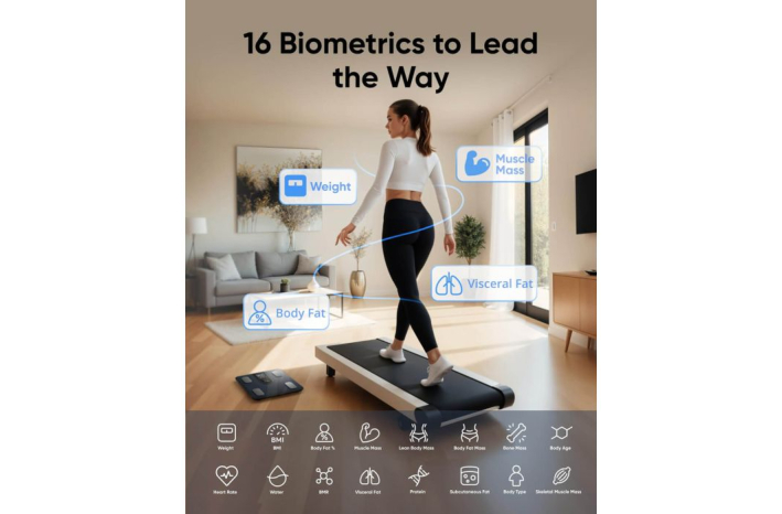 - 16 ključnih telesnih meritev na zaslonu: Takoj prejmite odčitke teže, telesne maščobe, mišične mase in še več, jasno prikazane na tehtnici za hitro oceno.