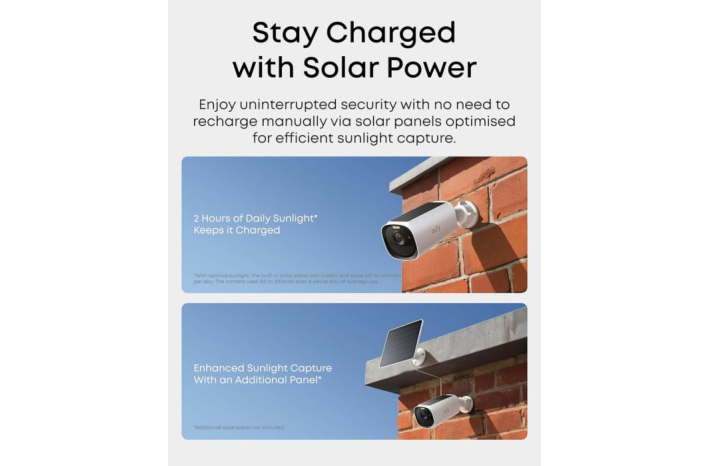 Tehnologija SolarPlus 2.0 zagotavlja učinkovito polnjenje in neprekinjeno varovanje. Uporabite vgrajeni sončni panel ali priključite zunanji panel za še več zajema sončne svetlobe. Kamera ostane napajana tudi ob oblačnem vremenu ali v delni senci.