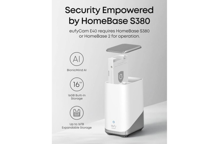 Upravljajte svoje naprave eufy s pomočjo HomeBase S380, ki vključuje 16 GB notranjega pomnilnika (razširljivo do 16 TB z zunanjim diskom – ni priložen). Vaši posnetki so varno shranjeni lokalno, brez skritih stroškov.