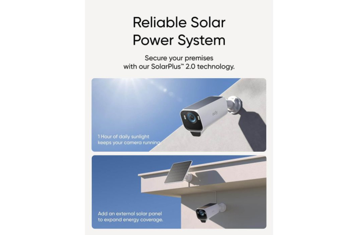 • Zanesljiv solarni napajalni sistem: Uživajte v miru skozi vse leto z neprekinjeno, zanesljivo varnostjo, ki jo poganja tehnologija SolarPlus™ 2.0. Izberite vgrajeno ploščo za enostavno učinkovitost ali dodajte zunanjo ploščo za večjo pokritost energije. Sistem ponuja prilagodljive možnosti montaže in zanesljivo rezervno napajanje za neprekinjeno varovanje.