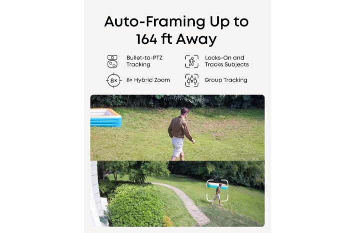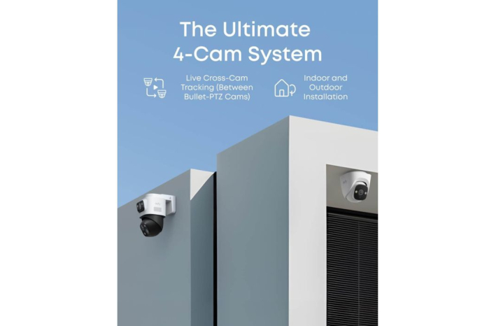Zaščitite celoten dom z dvema 4K fiksnima kamerama za nadzor območij in dvema kamerama Pan-Tilt-Zoom (PTZ), ki združujeta zgornjo fiksno 4K širokokotno lečo in spodnjo 2K PTZ kamero s 360° vrtenjem in 8× povečavo za aktivno sledenje.