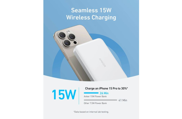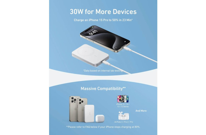 - Izjemno hitro brezžično polnjenje s 15W: Poskrbite, da bodo vaše naprave vedno napolnjene, kjerkoli ste, s 15W brezžičnim izhodom, ki je certificiran s Qi2, in ki napolni iPhone 15 Pro od 0 do 50 % v 51 minutah. Ima tudi 30W USB-C priključek za široko združljivost.