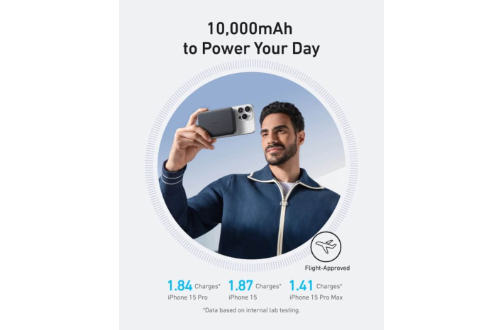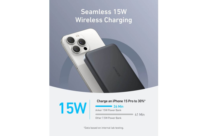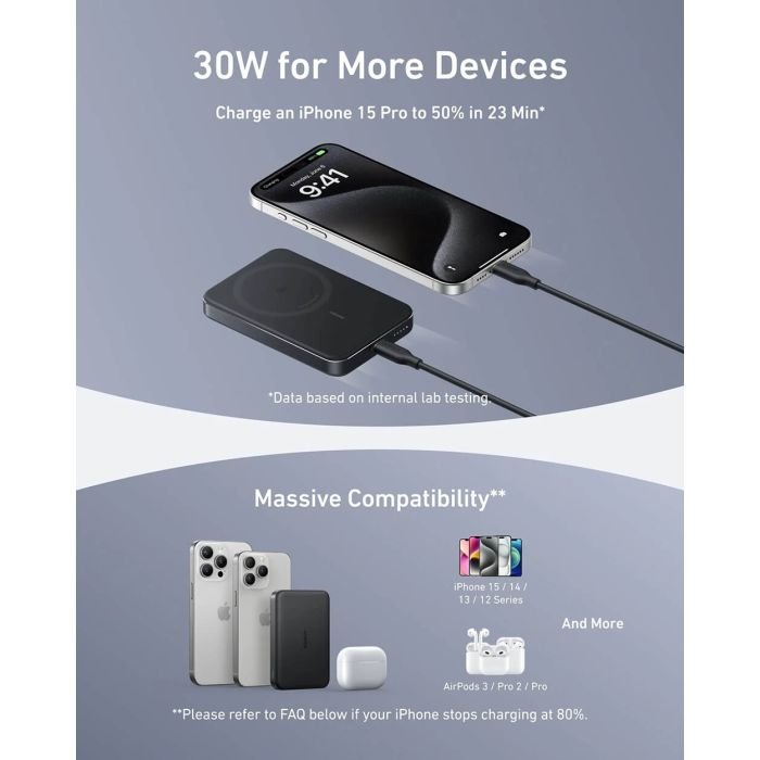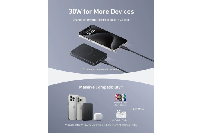 - Izjemno hitro brezžično polnjenje s 15W: Poskrbite, da bodo vaše naprave vedno napolnjene, kjerkoli ste, s 15W brezžičnim izhodom, ki je certificiran s Qi2, in ki napolni iPhone 15 Pro od 0 do 50 % v 51 minutah. Ima tudi 30W USB-C priključek za široko združljivost.