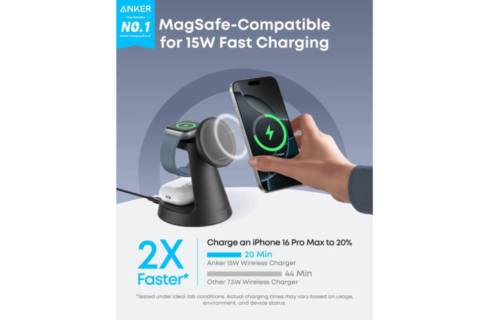 Anker MagGo brezžična polnilna postaja (3-v-1, s stojalom), 40W USB-C napajalnik, 1,5 m dolg USB-C na USB-C kabel, vodnik dobrodošlice, 24-mesečna garancija in prijazna podpora uporabnikom.