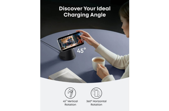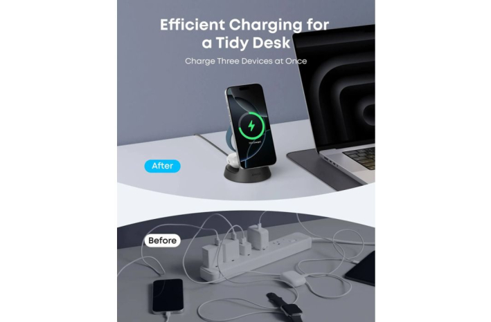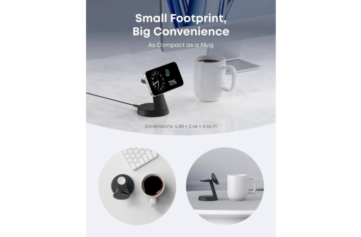 Idealen za delovne prostore brez navlake – ta kompaktni polnilnik se odlično prilega vsaki mizi in napaja vse od telefonov do pametnih ur.