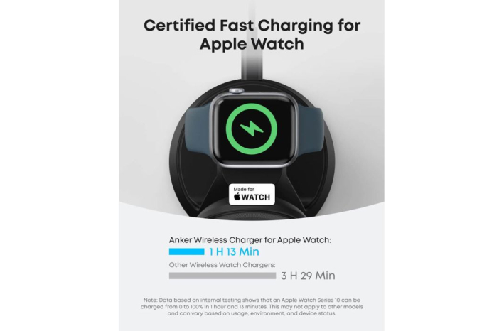 Z uradno certifikacijo omogoča, da napolnite Apple Watch Series 10 od 0 do 100 % v samo 1 uri in 13 minut. (Opomba: Podatek temelji na notranjem laboratorijskem testiranju; dejanski časi polnjenja se lahko razlikujejo.)