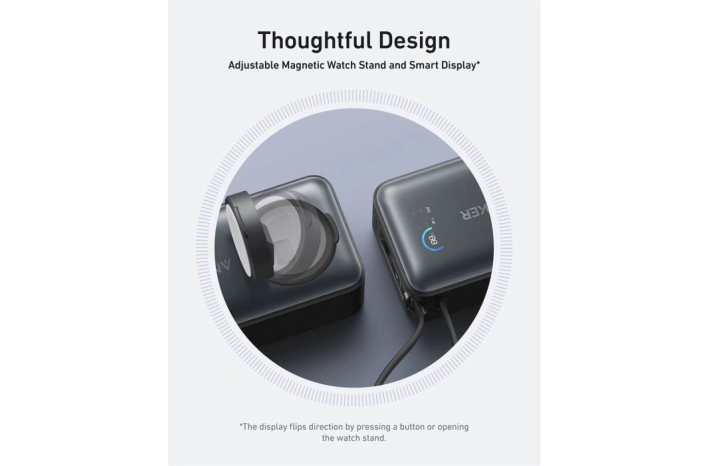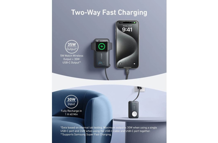 Podpira sočasno polnjenje naprav z vgrajenim kablom ali vhodom, ki ponuja do 30W, skupaj z brezžičnim polnilcem za uro, ki zagotavlja do 5W. Power bank se v celoti napolni v 1,5 urah z največ 30W vhodno močjo.