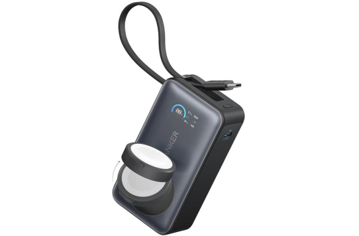 Nemoteno polnite svojo elektroniko z zmogljivim 10.000 mAh power bankom, ki vključuje nastavljiv polnilec za Apple Watch in vgrajen USB-C kabel za hitro polnjenje na poti.