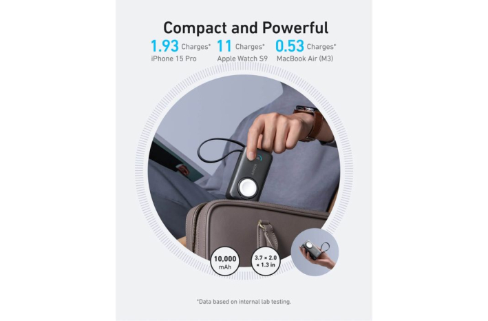 Kompakten kot standardna miška, meri le 3,7 × 2,0 × 1,3 palca, zato se zlahka prilega žepom ali torbicam. Power bank je popolnoma odobren za letenje in omogoča brezskrbno polnjenje med potovanji, zagotavlja približno dva popolna polnjenja za iPhone 15 Pro in do 11 polnjenj za Apple Watch Series 9.
