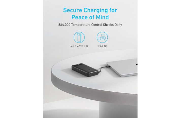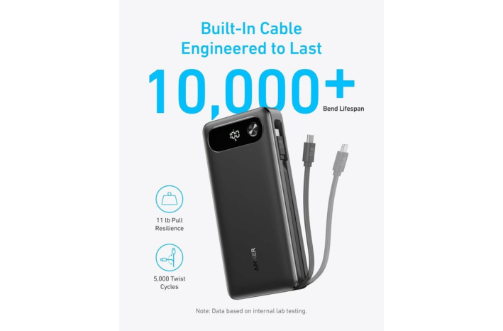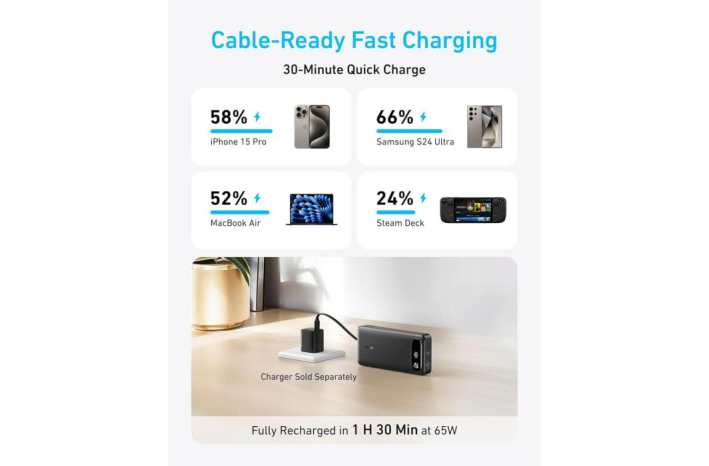 Hitro kabelsko polnjenje: Uporabite vgrajeni kabel za dvig baterije iPhone 15 Pro na 58 % ali MacBook Air na 52 % v 30 minutah. To prenosno baterijo lahko popolnoma napolnite v 1,5 ure z 65W polnilnikom.