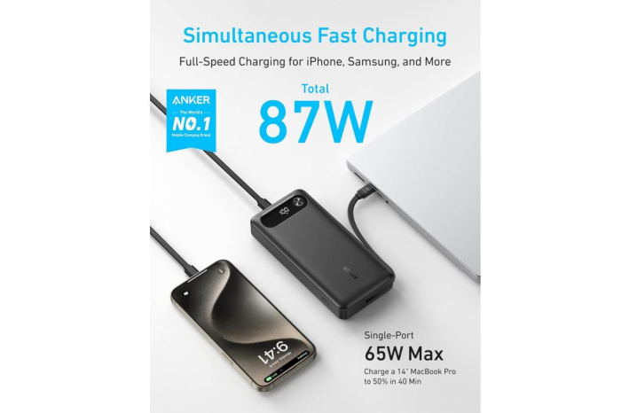 87W moči za deljenje: Razdelite 87W med tri naprave, pri čemer lahko ena naprava prejme do 65W, kar omogoča hitro polnjenje iPhone in Samsung telefonov. Hitro napolnite 14" MacBook Pro do 50 % v manj kot 40 minutah.