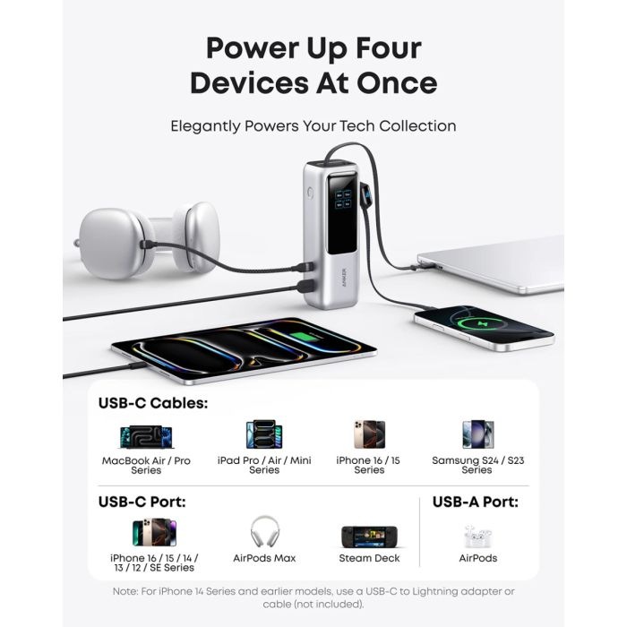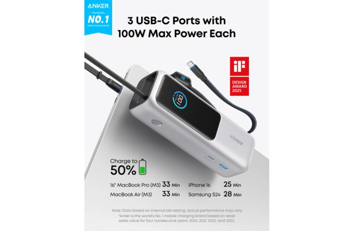 Anker Powerbank 25000 mAh z vgrajenim kablom USB-C, 165W, srebrn