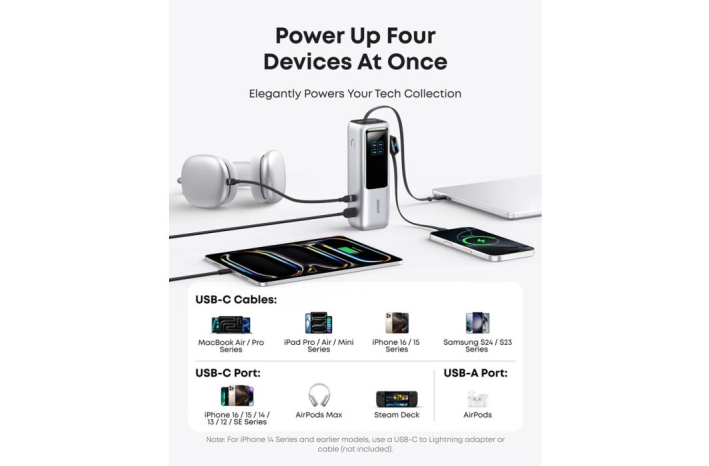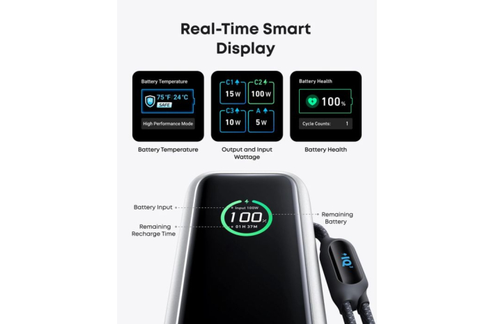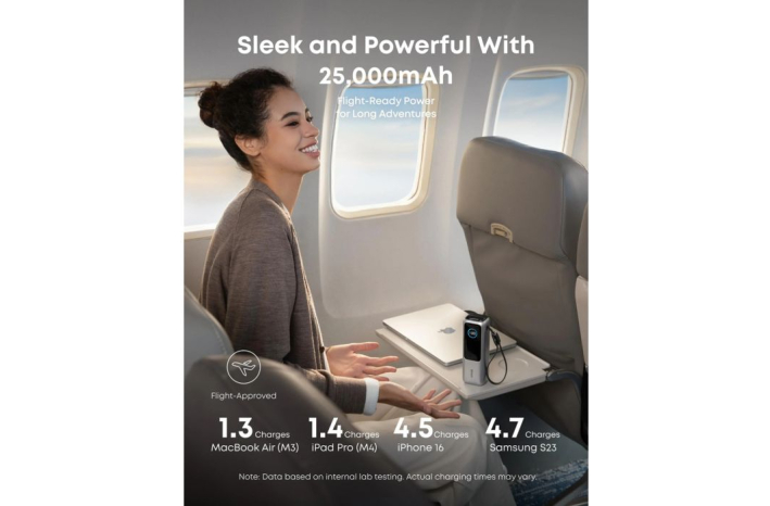 Odpravite se na dolga potovanja z ogromno kapaciteto 25.000 mAh, ki podpira večkratno uporabo vaših naprav. Ultra-hitro 100W polnjenje napolni baterijo do 30 % v samo 20 minutah.