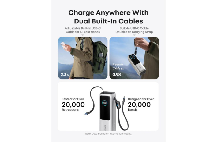 Opremljena z dvema USB-C kabloma – eden se raztegne do 70 cm in omogoča več kot 20.000 izvlekov, drugi pa meri 30 cm in služi kot trpežen nosilni trak, ki prenese več kot 20.000 upogibov.