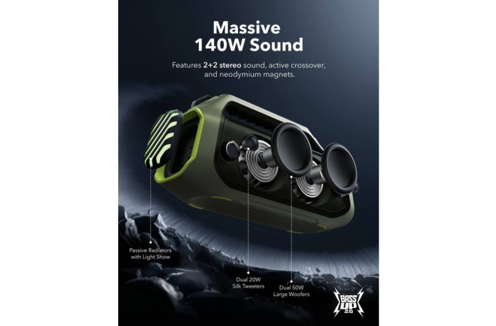 • 140W maksimalni bas: Občutite moč basa v vsaki pesmi z dvojnimi nizkotonci za globino in jasnost. Z BassUp️ 2.0 je izhod povečan s 100W na osupljivih 140W maksimalno - to je 160% več kot prva generacija BassUp.