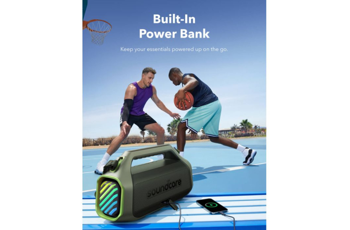 • 30W hitro polnjenje in vgrajena prenosna baterija: Združite z 30W polnilnikom, da popolnoma napolnite zunanji zvočnik Boom 2 Plus v samo 3 urah in predvajajte glasbo 20 ur. Z vgrajeno prenosno baterijo lahko napolnite telefon in druge potrebščine z 10W, kjerkoli ste. (Čas predvajanja se lahko razlikuje glede na raven glasnosti in vsebino predvajanja).