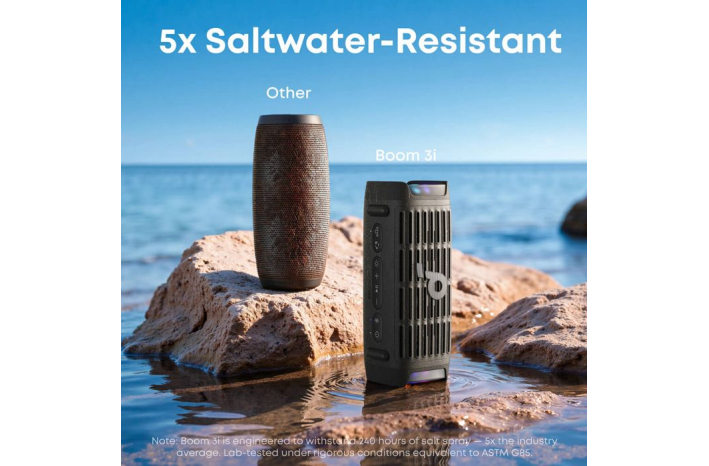 Boom 3i je zasnovan za vse vremenske pogoje – z robustnim ohišjem in zaščitnim premazom, ki ščiti pred morsko vodo, znojem in slanim pršcem. Medtem ko običajni zvočniki začnejo rjaveti v manj kot 5 mesecih, Boom 3i ostane odporen na korozijo do 2 leti uporabe na plaži, čolnu ali ob morju.