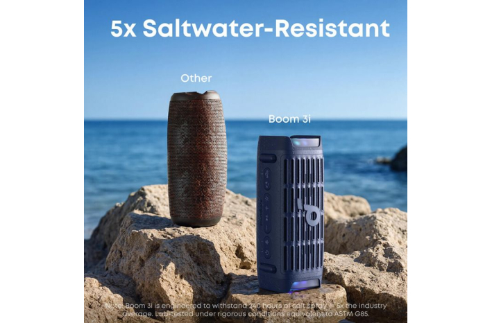 Boom 3i je zasnovan za vse vremenske pogoje – z robustnim ohišjem in zaščitnim premazom, ki ščiti pred morsko vodo, znojem in slanim pršcem. Medtem ko običajni zvočniki začnejo rjaveti v manj kot 5 mesecih, Boom 3i ostane odporen na korozijo do 2 leti uporabe na plaži, čolnu ali ob morju.