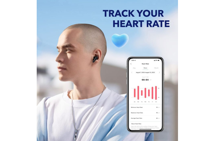 ušesni senzor srčnega utripa spremlja vaš srčni utrip med poslušanjem ves dan. Nosite prave brezžične ušesne slušalke Liberty 4 in preverite svoje dnevne podatke med vadbo in več prek Soundcore Wellness v aplikaciji.