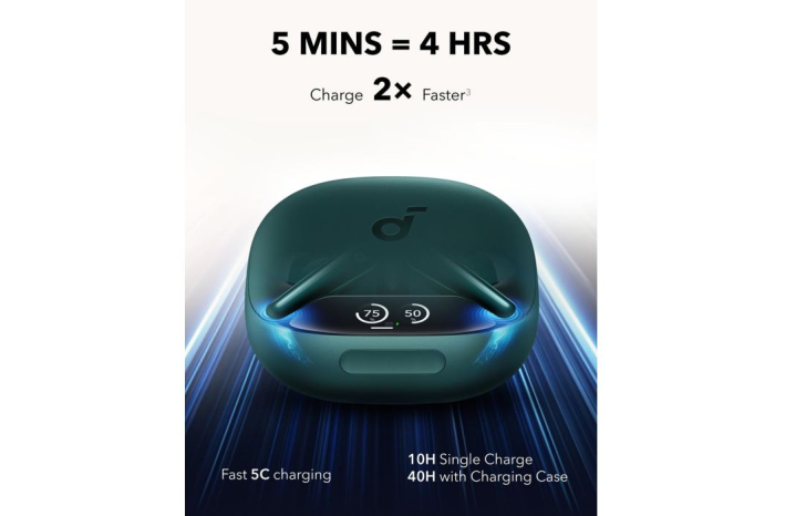 Prepolovite čas čakanja z našo 5C baterijo. S samo 5-minutnim polnjenjem pridobite 4 ure glasbene užitka, z do 40 urami miru, ki vas spremljajo na poti.