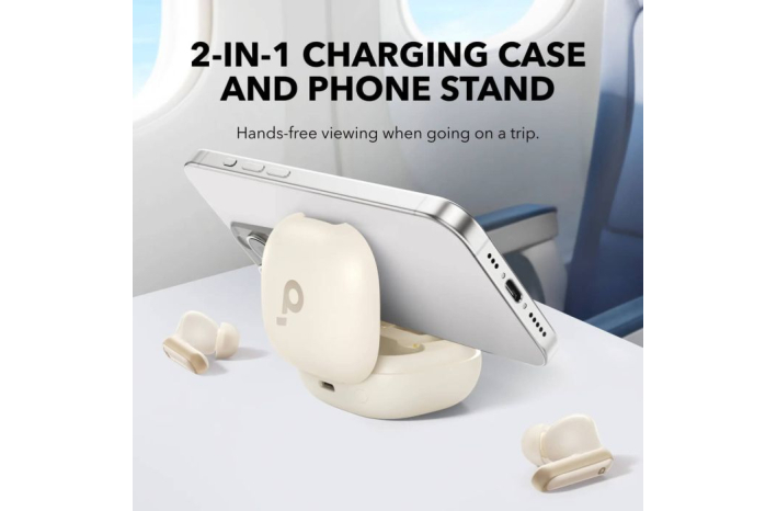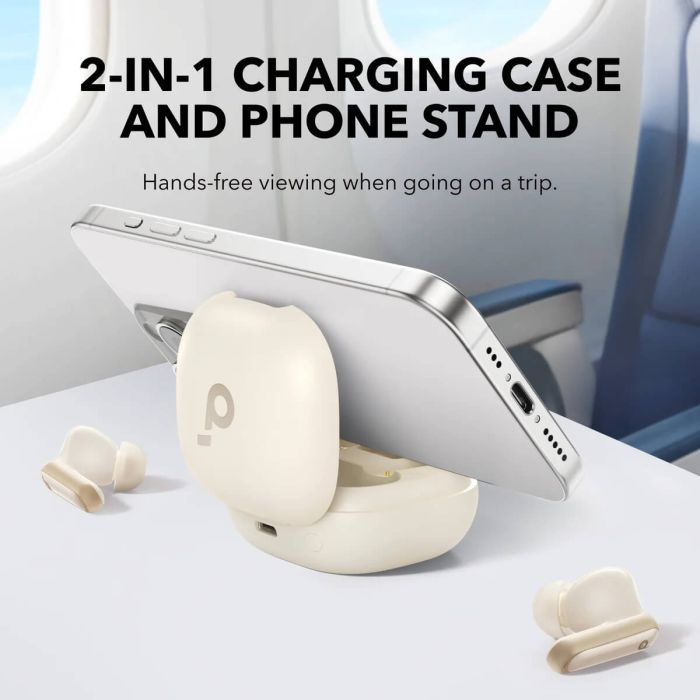 brezžične ušesne slušalke soundcore P40i imajo edinstveno etui za polnjenje, ki služi tudi kot stojalo za telefon, kar vam omogoča prostoročno uživanje v predstavah večnamenska zasnova izboljša vašo video izkušnjo, ko ste na poti.