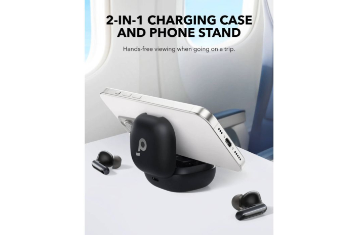 brezžične ušesne slušalke soundcore P40i imajo edinstveno etui za polnjenje, ki služi tudi kot stojalo za telefon, kar vam omogoča prostoročno uživanje v predstavah večnamenska zasnova izboljša vašo video izkušnjo, ko ste na poti.