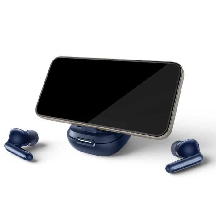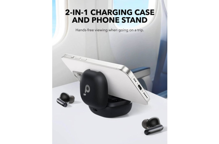 brezžične ušesne slušalke soundcore P40i imajo edinstveno etui za polnjenje, ki služi tudi kot stojalo za telefon, kar vam omogoča prostoročno uživanje v predstavah večnamenska zasnova izboljša vašo video izkušnjo, ko ste na poti.