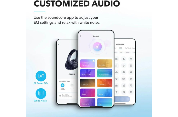 prenesite aplikacijo soundcore, da prilagodite svoj zvok z uporabo prilagodljivega izenačevalnika z 22 prednastavitvami ali pa ga prilagodite sami. Preklapljate lahko tudi med 3 načini: ANC, Normal in Transparency ter se sprostite z belim šumom.