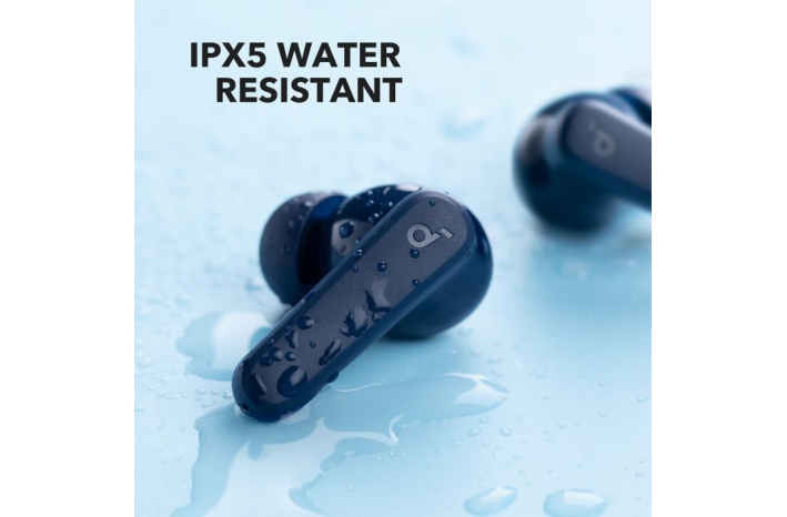 • Vodoodpornost IPX5: brezžične ušesne slušalke soundcore R50i so zaščitene pred brizgami vode, zato jih lahko nosite zunaj, tudi ko dežuje. *Opomba: ocena vodoodpornosti velja za ušesne čepke in ne za polnilno torbico