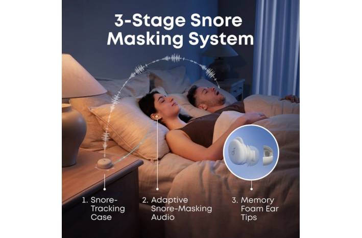 Prilagodljivo maskiranje smrčanja: Polnilna škatlica spremlja in analizira zvoke smrčanja, medtem ko slušalke nenehno optimizirajo zvočno maskiranje smrčanja. Uporablja se pomirjujoč beli šum, ki zmanjšuje nihanja v smrčanju in spodbuja miren spanec.