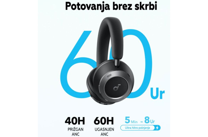 - Dolgotrajno poslušanje: Do 40 ur delovanja z aktivnim zmanjševanjem hrupa (ANC) in do 60 ur brez njega. Izjemno hitro polnjenje – 5 minut polnjenja omogoča do 8 ur poslušanja.
