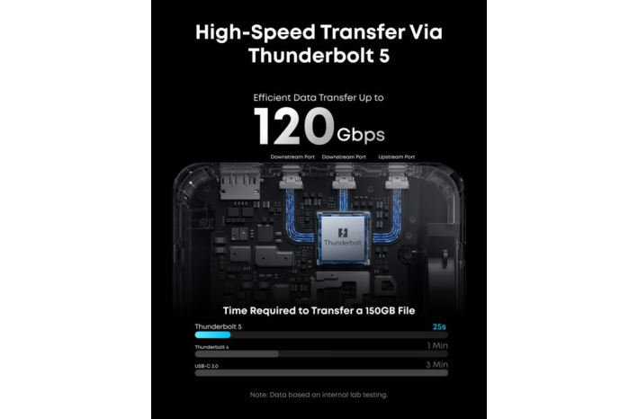 Opremljen s Thunderbolt 5 vhodnim priključkom, dvema Thunderbolt 5 izhodnima priključkoma, dvema USB-C priključkoma, tremi USB-A priključki, SD in TF čitalnikoma kartic, AC vhodom, 2,5 Gbps Ethernet priključkom, avdio vhodom in HDMI 2.1 ali DisplayPort 2.1 priključkom. Vključuje tudi napreden sistem aktivnega hlajenja za optimalno delovanje tudi pri polni obremenitvi, ki preprečuje pregrevanje.