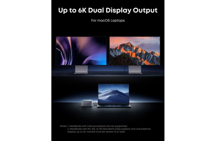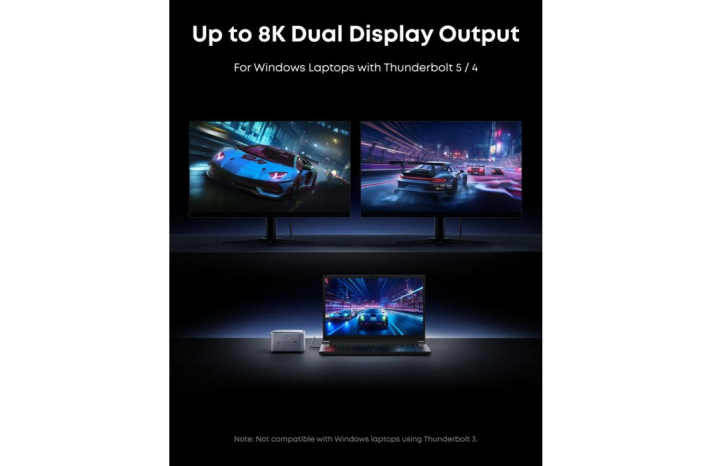 Podpira en HDMI ali DisplayPort in dva Thunderbolt 5 izhodna video priključka. Omogoča prikaz do 8K@60Hz za en sam zaslon ali dvojni 8K@60Hz prikaz za prenosnike s Thunderbolt 5 in operacijskim sistemom Windows.