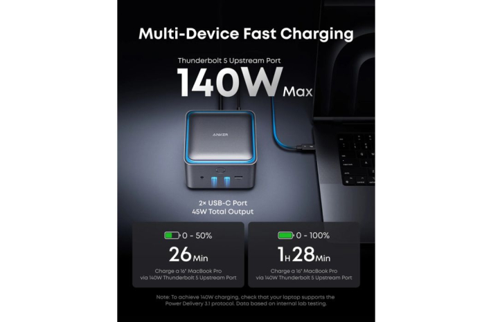 Učinkovito napajajte svoje naprave z močnim 140W Thunderbolt 5 vhodnim priključkom, ki podpira protokol PD 3.1 za optimalno polnjenje. Sprednja dvojna USB-C priključka skupaj zagotavljata skupno moč 45 W.