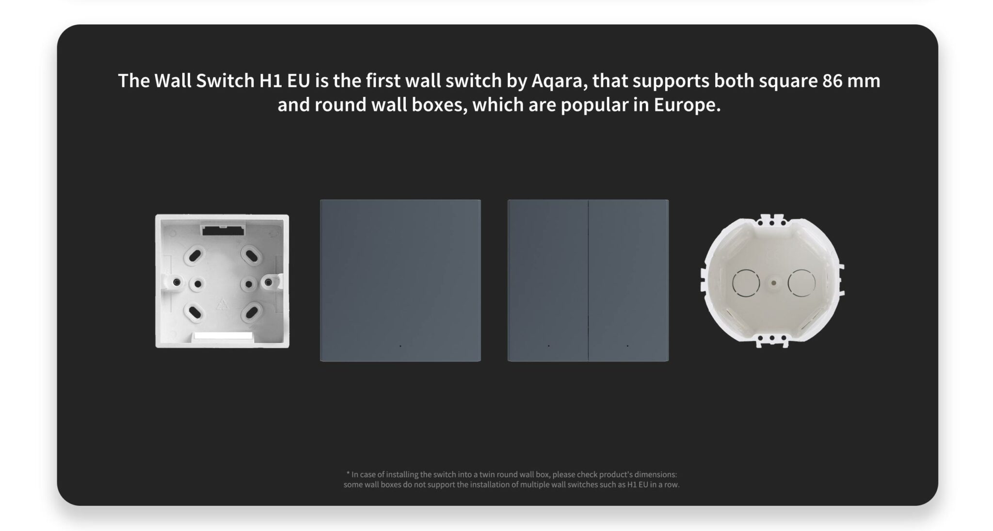 Pametno stensko stikalo Aqara H1 EU podpira kvadratne 86 mm in okrogle stenske škatle tipa EU. (Opomba: niso podprte vse škatle z dvojno/dvojno steno. Pred nakupom preverite dimenzije izdelka.)