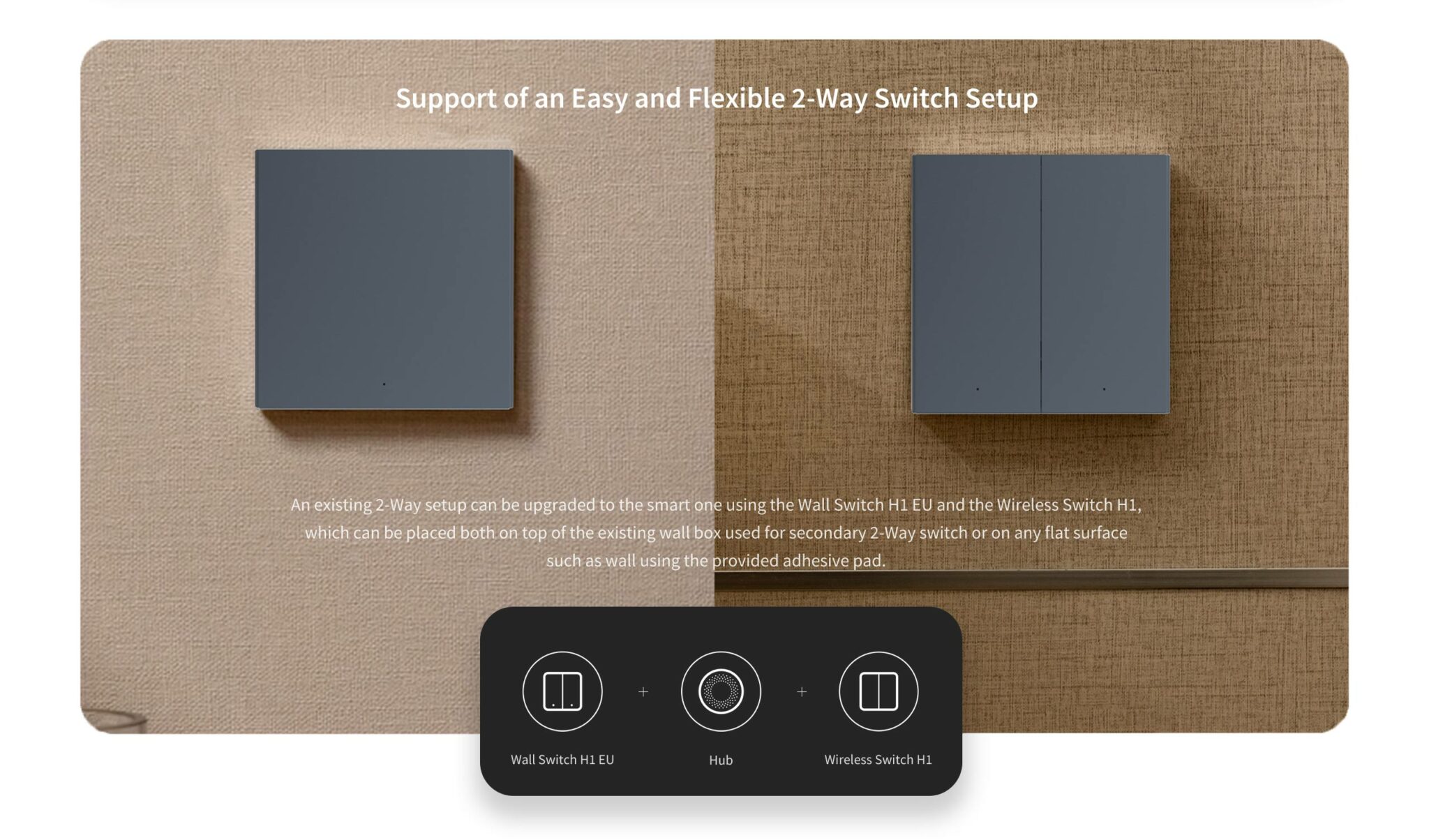 Več primerov uporabe lahko dosežete s kombinacijo pametnega stenskega stikala H1 EU z drugimi izdelki Aqara. Z brezžičnim stikalom Aqara H1 EU lahko enostavno upravljate iste luči z dveh ali več lokacij, ne da bi vam bilo treba dodati dodatno ožičenje. (Opomba: za dvosmerno nastavitev je potrebno dodatno brezžično stikalo H1.)