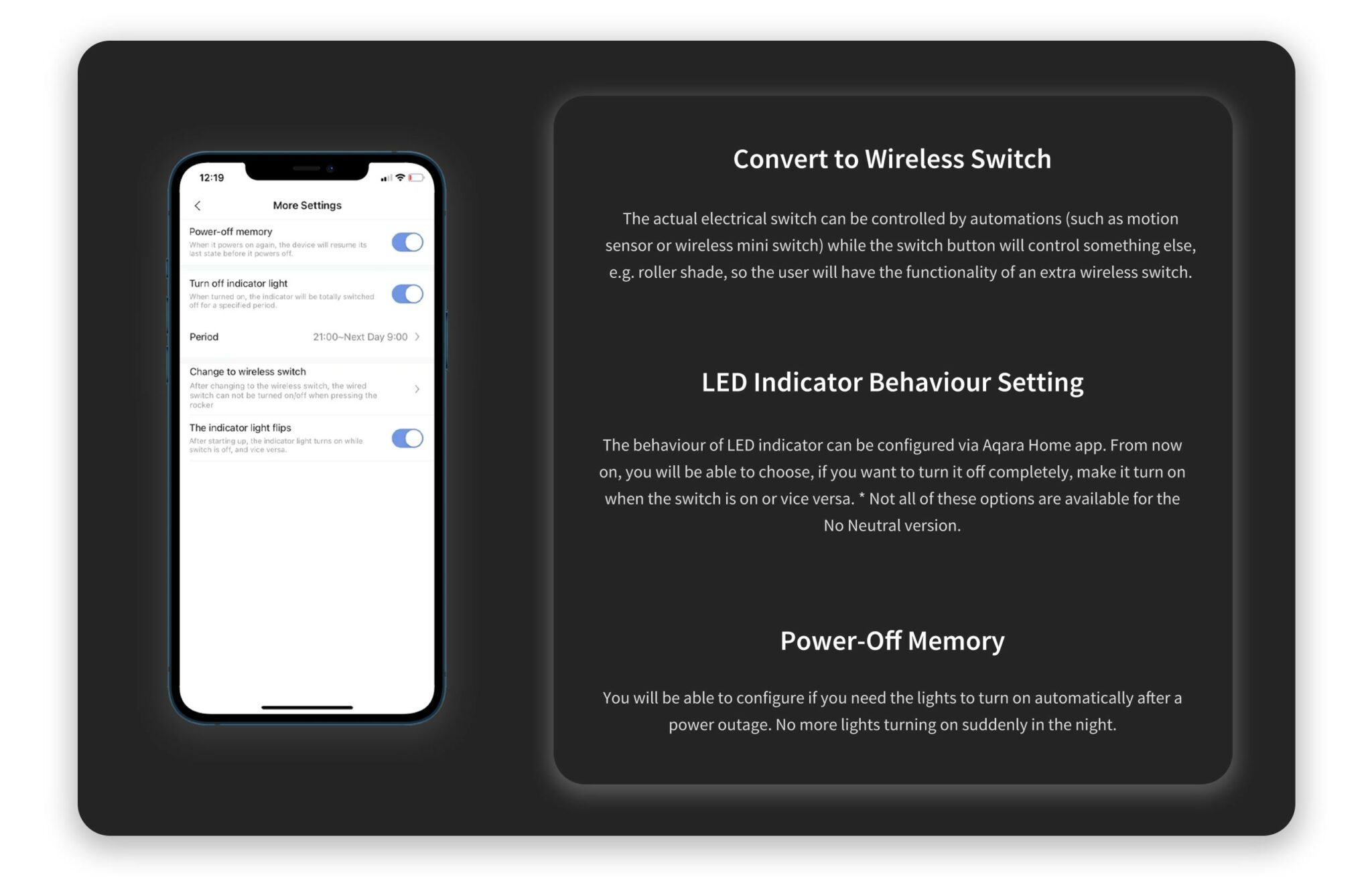 Aqara pametno stensko stikalo H1 EU je lahko del vaše rešitve za avtomatizacijo doma. S pretvorbo v funkcijo brezžičnega stikala lahko naše stikalo na primer upravljate z avtomatiko s senzorjem gibanja Aqara ali brezžičnim mini stikalom Aqara, medtem ko bo gumb za stikalo krmilil nekaj drugega.