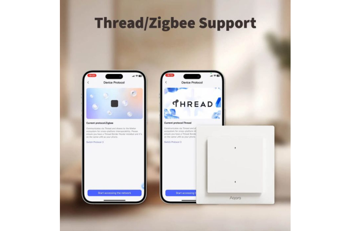 Stikalo Aqara Light Switch H2 EU podpira Matter over Thread za povezavo s tretjimi ekosistemi in Zigbee za integracijo z Aqara Home. Uporabniki lahko izbirajo med Thread za širšo združljivost ali Zigbee za dostop do Aqara funkcij, kot sta MARS tehnologija in nastavitve LED osvetlitve.
