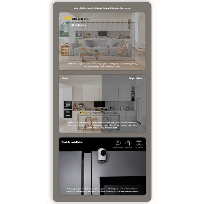 - 146° širokokotni objektiv in senzor 1080p: G2H Pro zdaj podpira še širši vidni kot (diagonala) zaradi odsotnega popravka popačenja, kar daje sliki, ki jo posname senzor 1080p, bolj "ribje oko" videz .