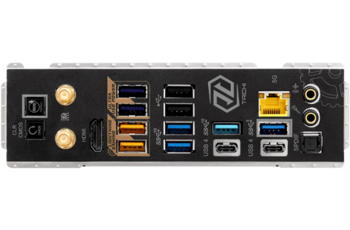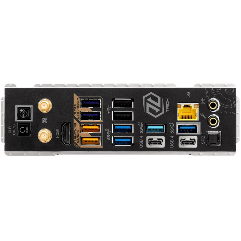 | Zunanji konektorji: | 2x antena 1x HDMI 1x SPDIF izhod 2x USB4 Type-C 5x USB 3.2 Gen2 Type-A (USB32_12 are Lightning Gaming Ports.) 3x USB 3.2 Gen1 Type-A (USB32_34 Ultra USB Power.) 2x USB 2.0 1x RJ-45 LAN 1x Clear CMOS 1x BIOS Flashback 1x Line izhod (Gold Audio Jack) 1x Mikrofon vhod (Gold Audio Jack) |