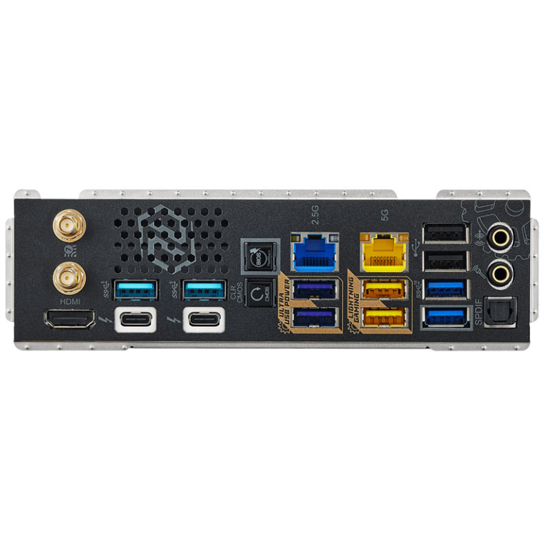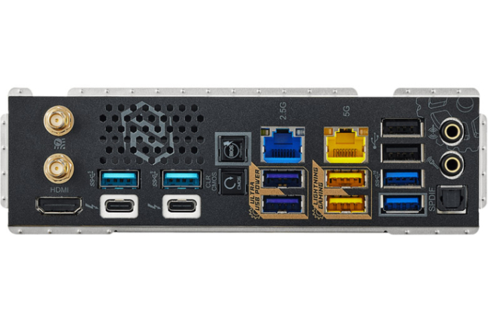 | Zunanji konektorji: | 2x Antena 1x HDMI 1x Optical SPDIF Out 2x Thunderbolt 4 Type-C (40 Gb/s za USB4; 40Gb/s za Thunderbolt) 4x USB 3.2 Gen2 Type-A (10 Gb/s) 4x USB 3.2 Gen1 2x USB 2.0 2x RJ-45 LAN 1x Clear CMOS gumb 1x BIOS Flashback gumb 1x Line Out Jack (Gold Audio Jack) 1x Microphone Input Jack (Gold Audio Jack) |