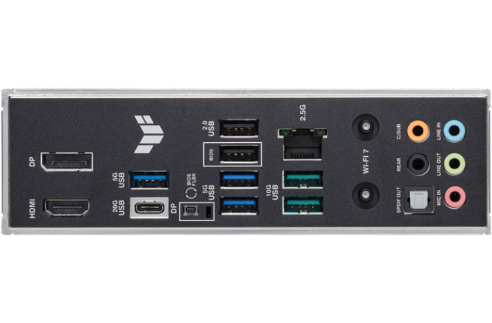 Zunanji Konektorji:1x USB 3.2 Type-C 20Gbps z DP Alt mode, 2x USB 3.2 Type-A 10Gbps, 3x USB Type-A 5Gbps, 2x USB 2.0 Type-A, 1x DisplayPort, 1x HDMI port, 1x Wi-Fi modul, 1x Realtek 2.5Gb Ethernet, 5x Audio jack, 1x Optical S/PDIF izhod, 1x BIOS FlashBack gumb