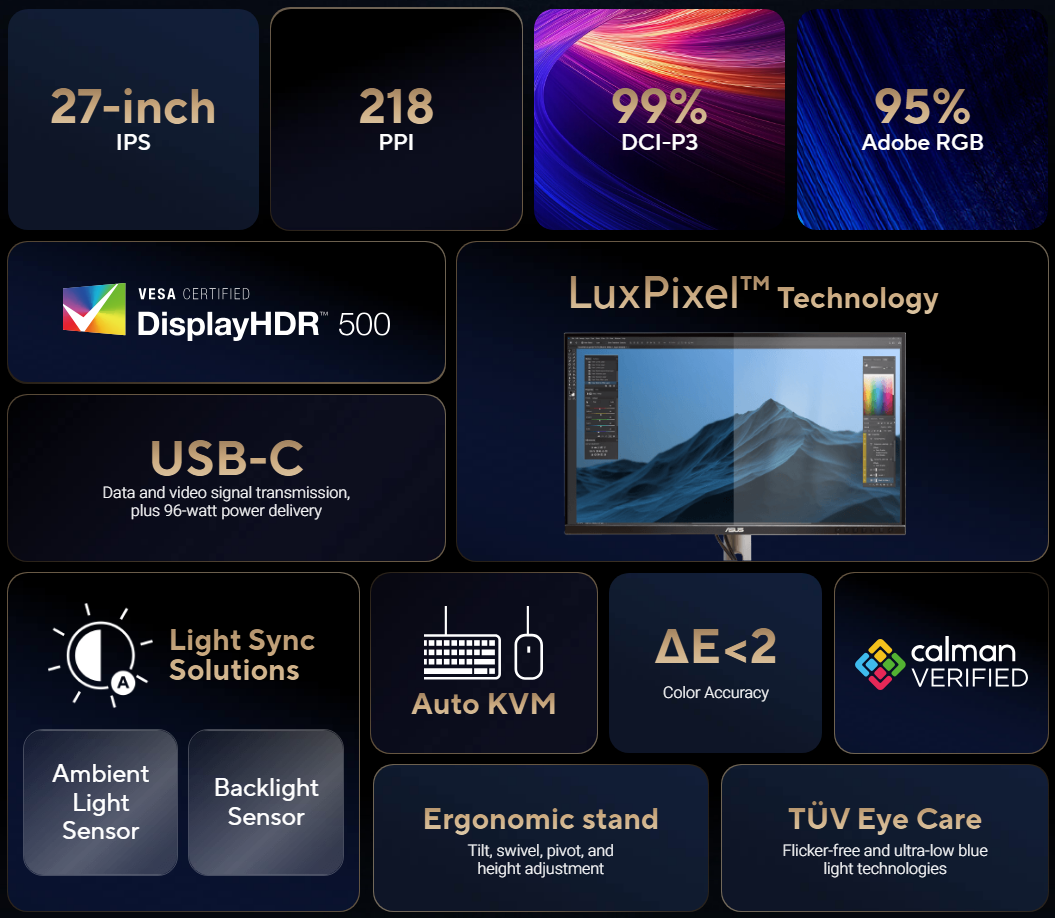 ASUS ProArt Display 5K PA27JCV Profesionalni Monitor - 27-palčni, IPS, 5K (5120 x 2880), 99% DCI-P3, LuxPixel™ AGLR, Light Sync, barvna natančnost deltaE < 2, Calman Verified, USB-C PD 96W, VESA DisplayHDR 500 in VESA MediaSync, Auto KVM, ergonomsko stojalo, okolju prijazna zasnova.