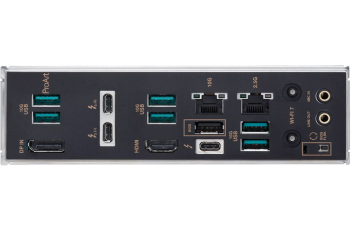 | Zunanji konektorji: | 2x Thunderbolt 5 USB Type-C 1x USB4 / Thunderbolt Type-C 6x USB 3.2 gen1 10Gbps Type-A 1x USB 2.0 1x DisplayPort (samo vhod) 1x HDMI 1x Wi-Fi modul 1x Marvell AQtion 10Gb 1x Intel 2.5Gb 2x Gold-plated audio jacks 1x BIOS FlashBack gumb |