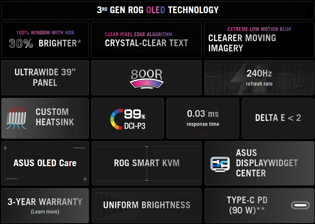 ASUS ROG Swift OLED PG39WCDM je 39-palčni ukrivljen gaming monitor, ki združuje vrhunsko tehnologijo in vrhunsko zmogljivost. Z OLED panelom, 240Hz osveževanjem in 3440x1440 ločljivostjo bo vsaka igra in film oživel na zaslonu.